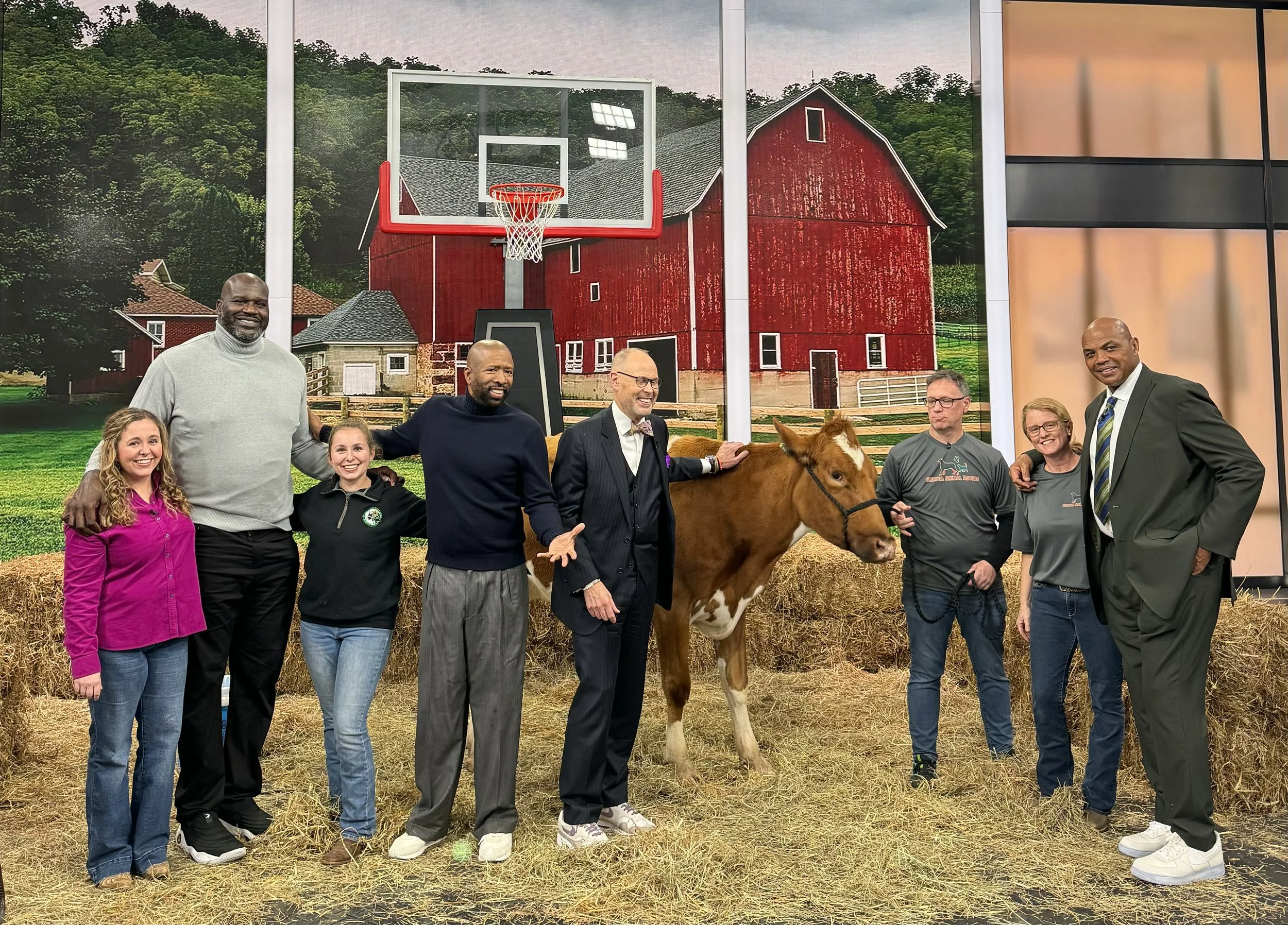 BSCD team and Rosie the Red Holstein, teach Shaquille O'Neal how to milk a cow at dairy convention in Atlanta, GA; cir. 2024. Photo provided by Katelin Benkoski.
