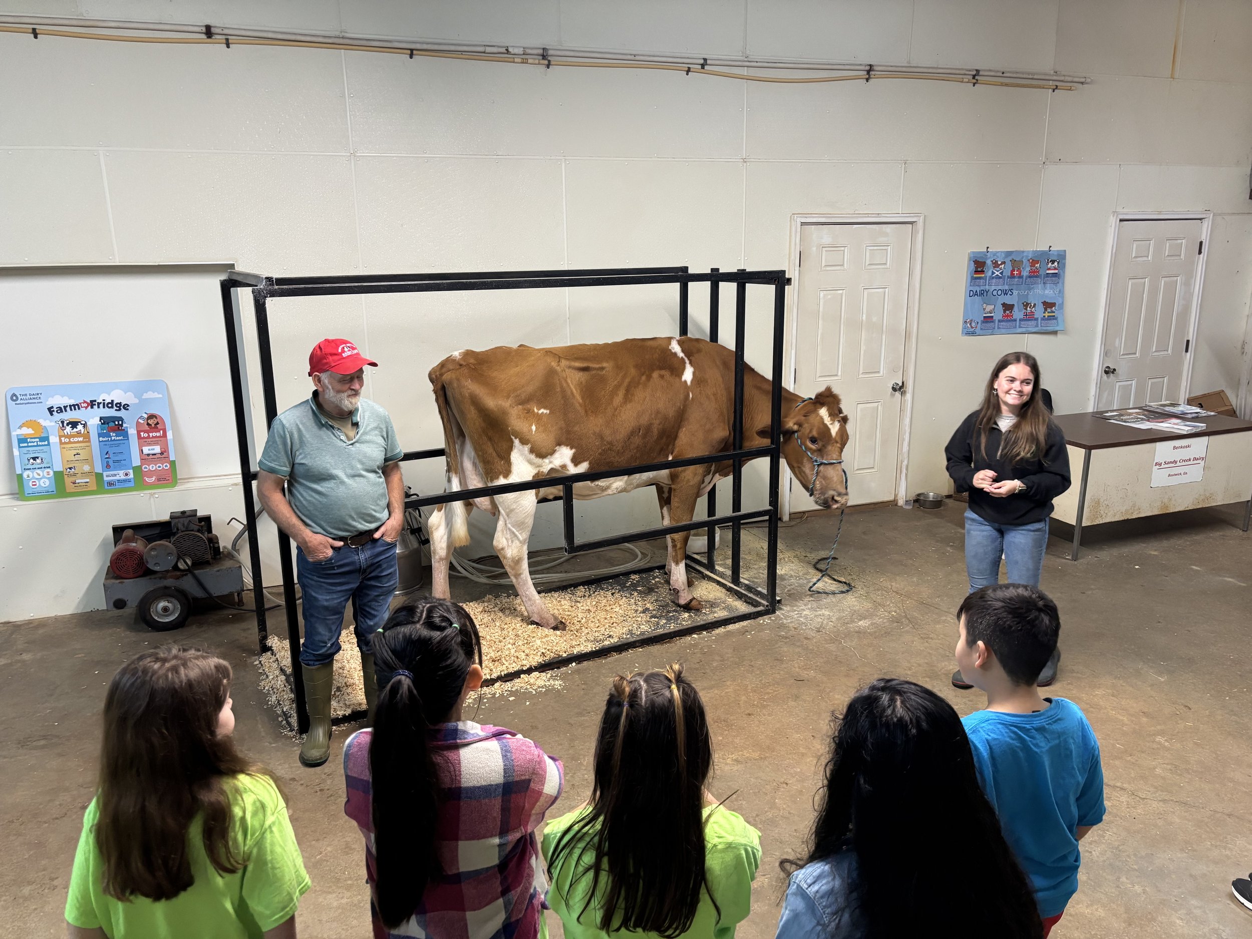 Farmer John and Brooke educate a group of students about how cows are milked during a field trip.