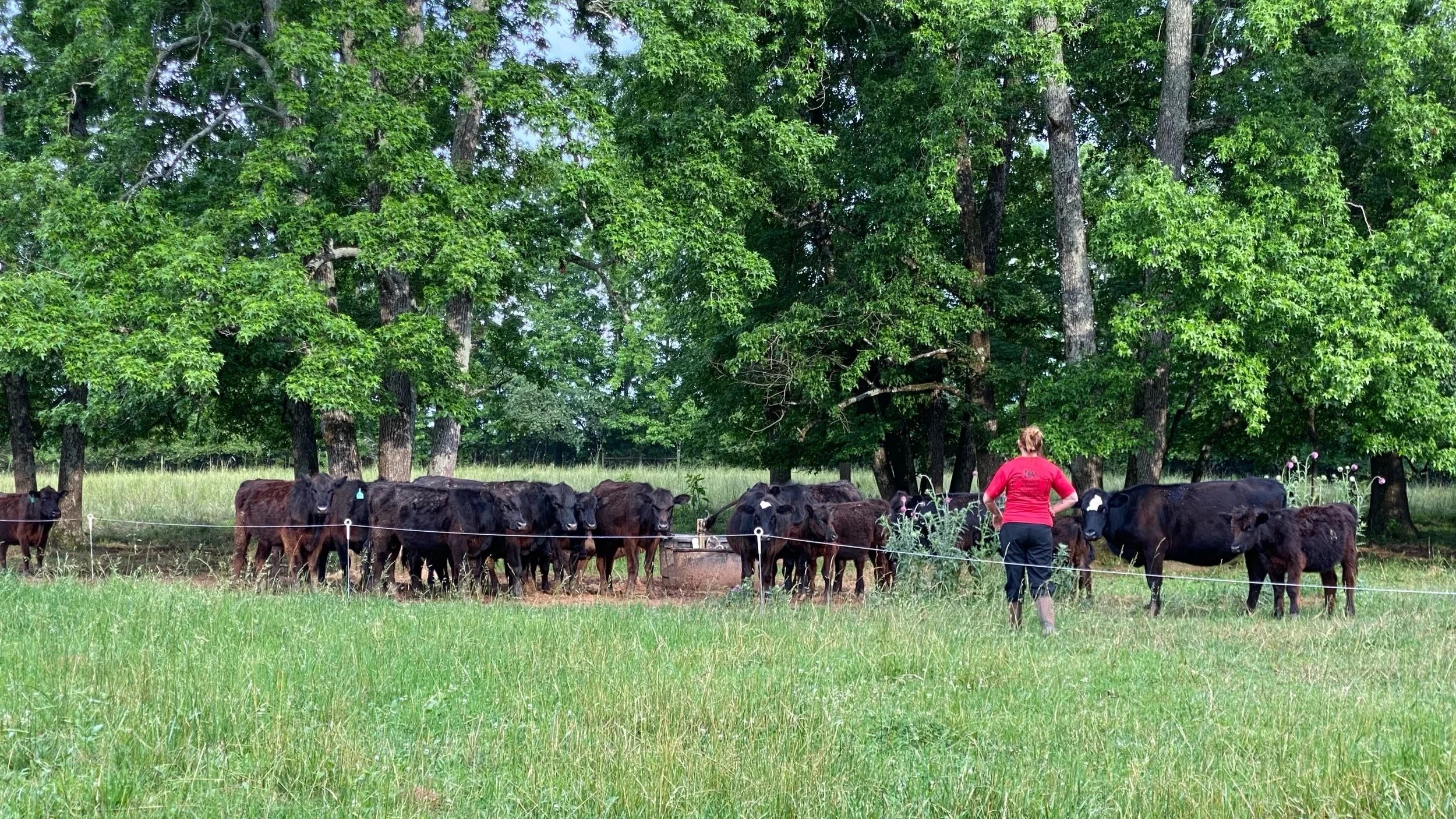 A woman checks on a herd of Simmental-Angus cattle.